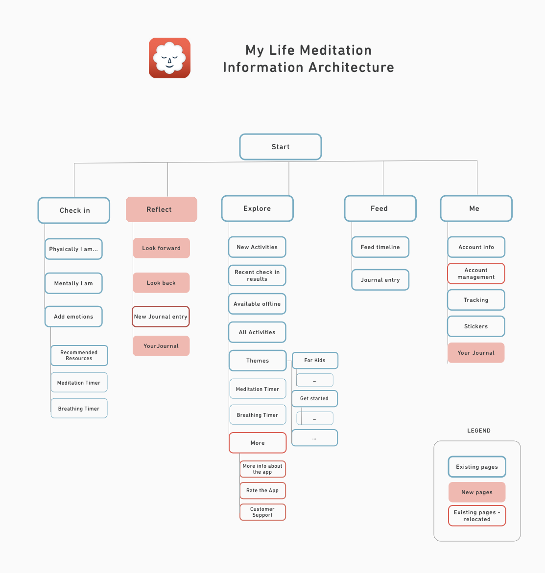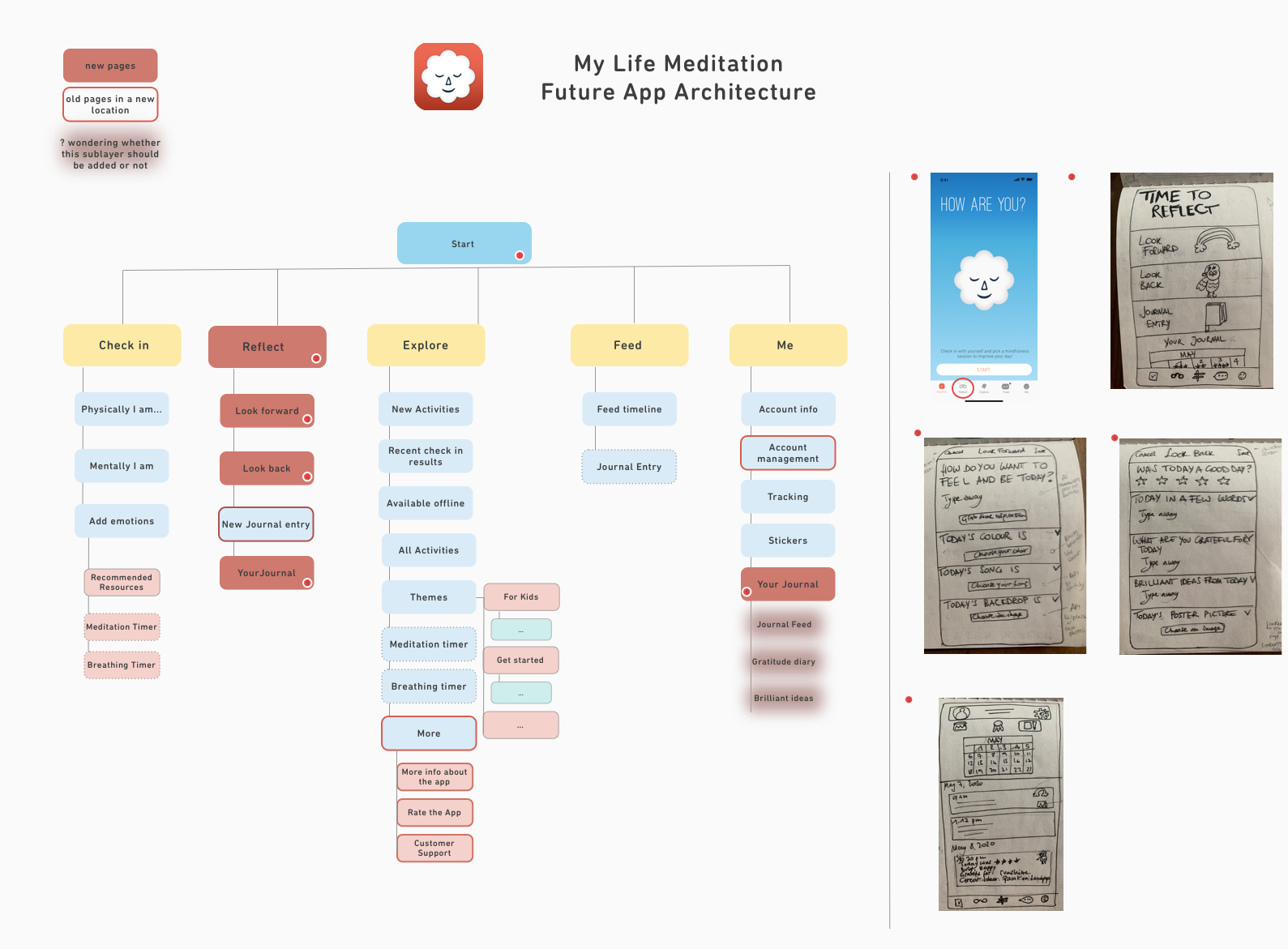 I started off mapping the current architecture and decided to create a new 'Reflect' section, which would be accessible through the App's bottom navigation menu and replace the current 'More' function (whose content I redistributed). My choices were aimed at creating a consistent flow within the mindful reflection elements of the App, while minimising alterations to current navigation.