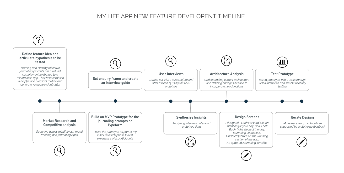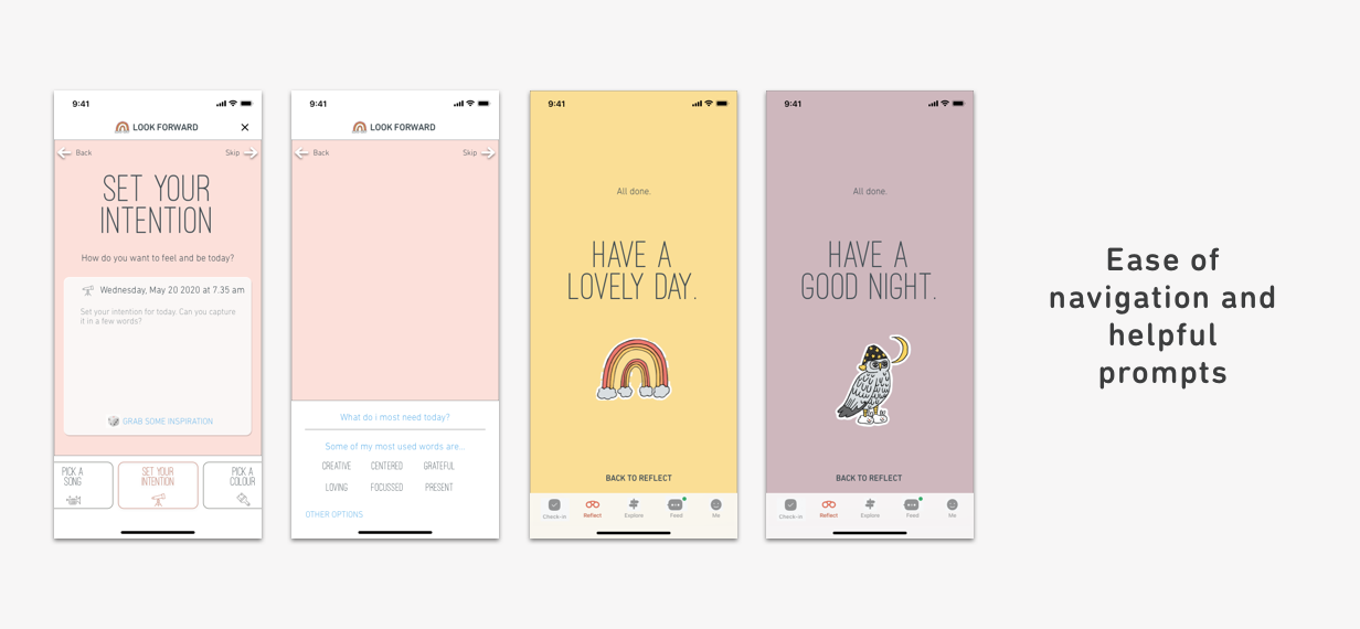 My hypothesis was that a digital journaling feature focussed on setting an intention for the day ahead and looking back on the day just past could offer users a helpful reflection opportunity and lay the foundations for a routine that supports better emotional health.