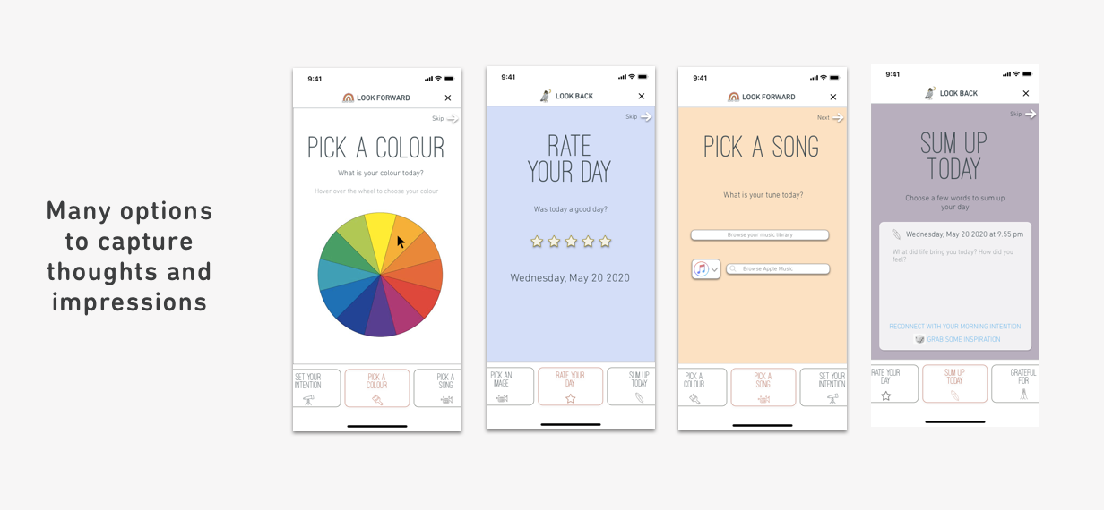 In designing the new screens I was mindful of providing options to capture different preferences, in line with key insights surfaced from the research. For example, I included screens that invite the user to pick a colour or a song as a way of expressing their intended mood for the day.