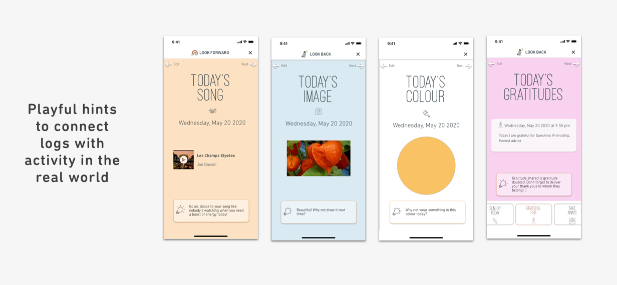 Insights from user testing prompted design tweaks to improve navigation (e.g. adding captions alongside arrows to make navigation within journaling sequences more straightforward). They also inspired the development of playful prompts that aim to bridge the digital-analogue gap by turning a log in the App into an action in the real world.