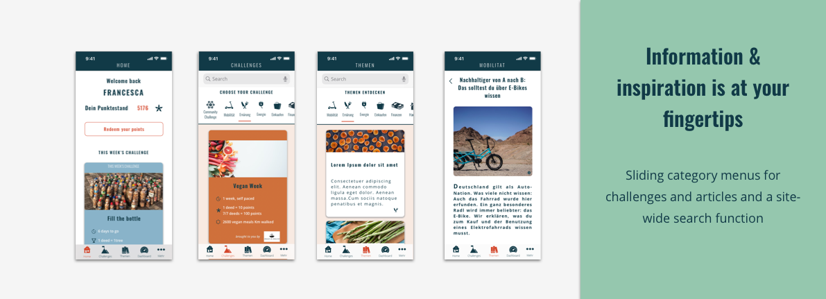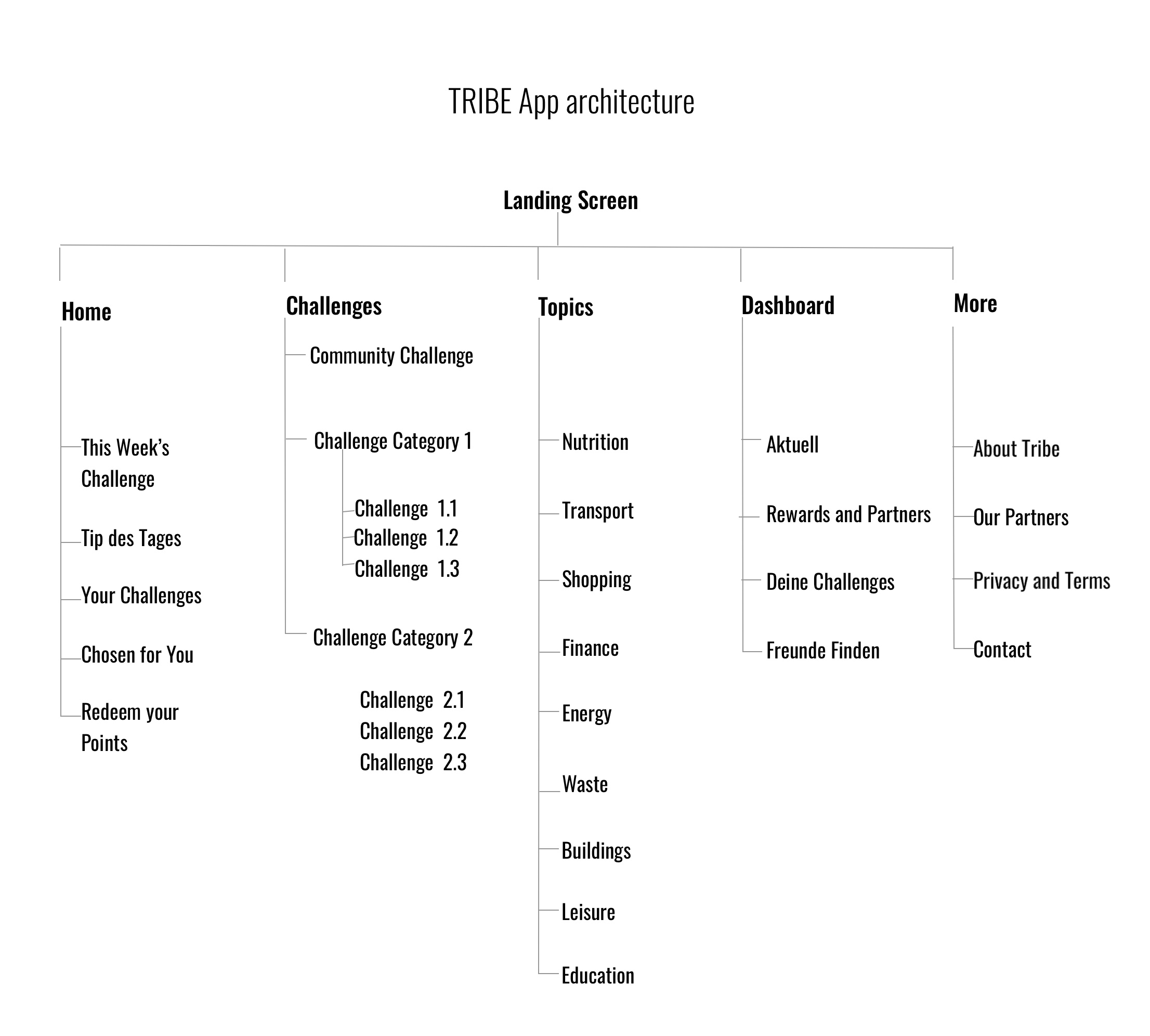 In the App Architecture we created a structure revolving around the core offers of: Information topics; Challenges and an individual Dashboard, with a Home Page showcasing current platform current and member activity and a More section to include information about the App, Partners and Tribe itself.