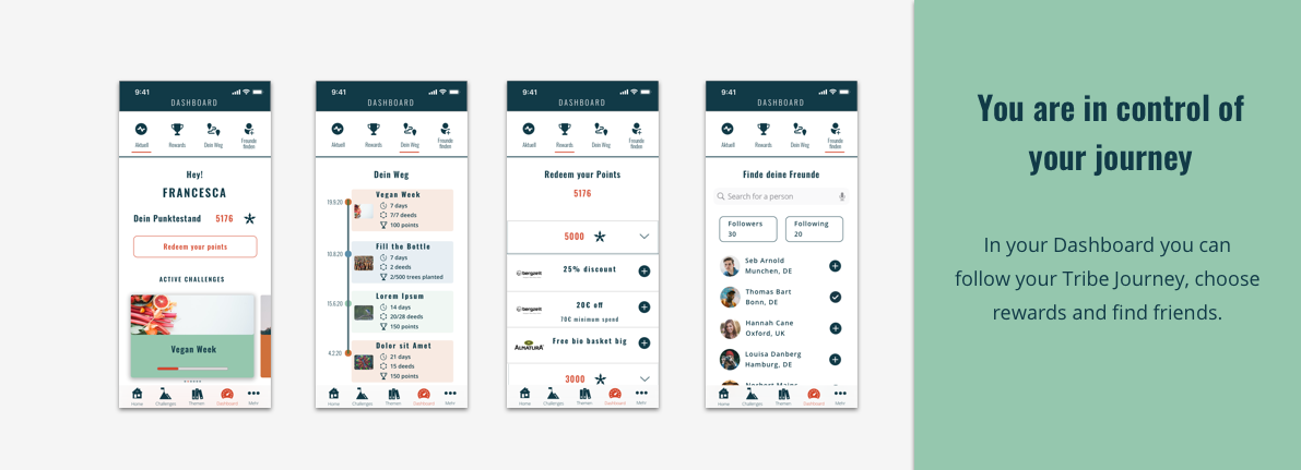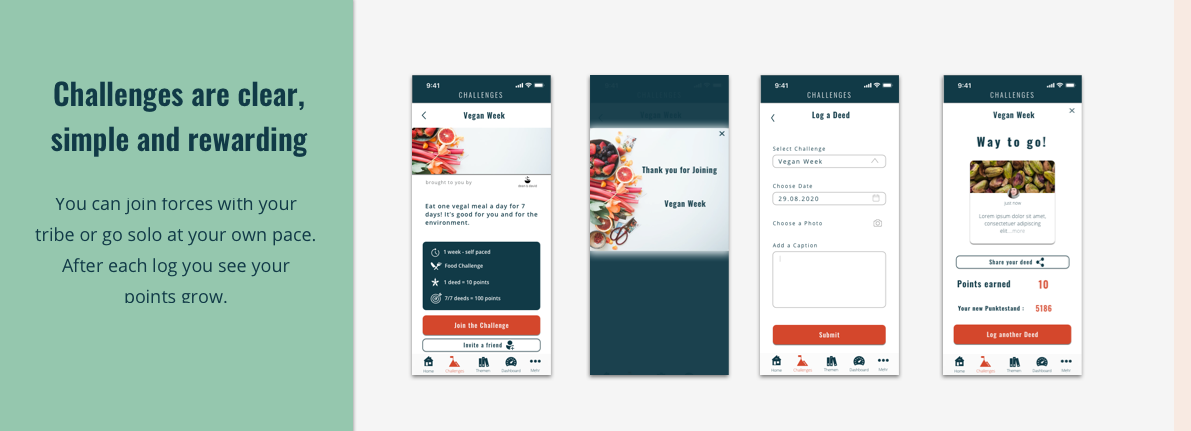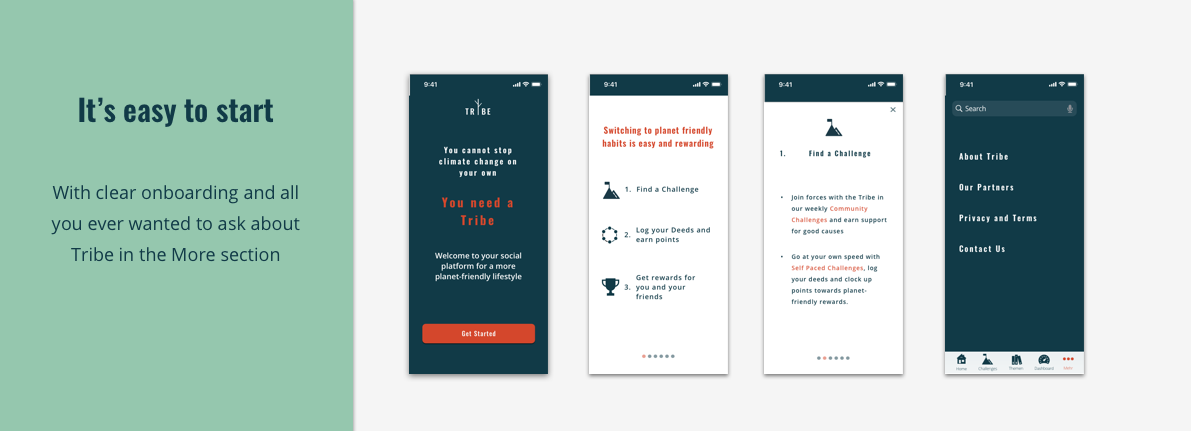 Usability tests on the prototype prompted improvements in the onboarding process to make the Tribe concept clear from the very beginning, and some tweaks to the Challenge page design, to provide more information at a glance.